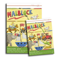 Hahnemühle s'intéresse aujourd'hui à la jeune génération d'artistes et a créé un papier de peinture pour enfants, le Malblock en 100 g/m². Ce papier sans acide a été testé par des enfants et avec des techniques utilisant beaucoup d'eau. Il est particulièrement résistant et ne gondole pas. Il sera le support idéal pour les dessins au feutre, crayons de couleurs et à l'aquarelle de nos petits artistes en culotte courte.