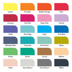 Carefully curated to offer a balanced range of vibrant, neutral and mid tones, this set is versatile for a wide variety of arts and illustration work. It's also perfect for anyone looking to build their Promarker collection. This set includes: Vibrant tones like Bright Orange, with its pure, blazing radiance, and Hot Pink, the reddest shade on the Promarker spectrum of pinks. Neutral tones including Cool Grey 2 – the second lightest in the Cool Grey family, perfect for highlighting objects, or using as a base colour for black objects – and Cool Grey 4, a dark shade to create intriguing shadows for black objects. Mid tones like Lemon, a light to mid-range yellow, and Soft Green, full of minty blue undertones. Full list of colours: Lemon, Pumpkin, Bright Orange, Red, Crimson, Hot Pink, Rose Pink, Orchid, Violet, Duck Egg, Cyan, True Blue, Midnight Blue, Turquoise, Soft Green, Moss, Grass, Green, Cocoa, Saffron, Putty, Cool Grey 2, Cool Grey 4 and Black.