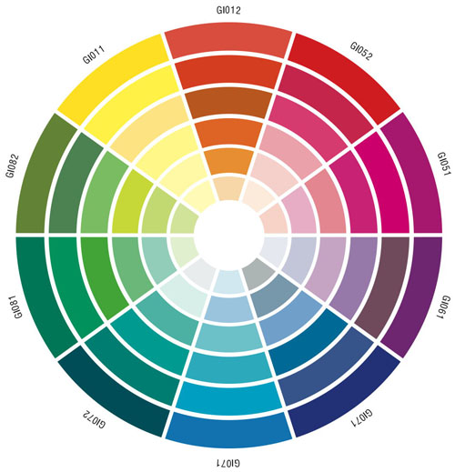La numérotation des couleurs du nuancier Graph'It est décomposée en 4 chiffres signifiants. Une fois ce système intégré, il devient facile de se repérer sur le nuancier. Les 2 premiers chiffres placent la couleur sur le fameux cercle chromatique et indiquent le code pour la famille de couleurs. Ces chiffres suivent l'ordre intuitif du cercle : on commence au 11 Jaune en passant par le 52 Rouge pour finir au 82 Vert Jaune. Seules les couleurs grises et noires commençant par 9 ne figurent pas sur la roue, ainsi que le Blender 0000.