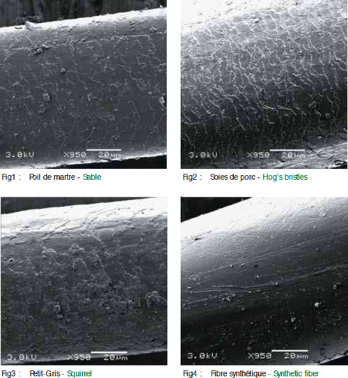 Pouvoir d'absorption de la couleur - plus le poil est fuselé, plus son ventre est accentué, meilleure est sa rétention capillaire, et plus la distribution de la couleur sera régulière ; les poils naturels ont des écailles garantissant cette fonction (voir photo 1, 2 et 3 sous microscope électronique), vitale pour les techniques liquides ou semi-pâteuses. Les fibres synthétiques n'ayant pas d'écailles (voir photo 4) laissent glisser la couleur.