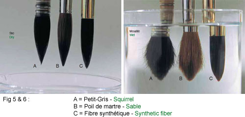 Plongé dans l'eau le poil de petit-gris se gonfle visiblement d'eau et double quasiment de volume, le poil de martre se dilate sensiblement tandis que la fibre synthétique reste identique. Cette expérience vise à prouver le pouvoir de rétention d'un pinceau selon le type de fibre sélectionnée.