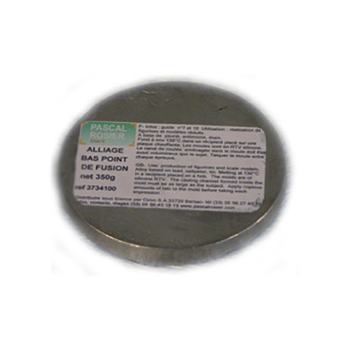 Alliage spécial pour figurines, sans plomb, a base d'antimoine et d'étain, fond à 136°C dans un récipient placé sur une plaque chauffante.