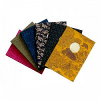 Carnet Exlibris, 160 pages blanches lignées, pages de garde et couverture dure en lamali Lokta. Sur la page de garde de devant, visible à travers le jour de la couverture, se trouve un exlibris imprimé or. Taille : approx. 15x21cm. Fait main au Népal.