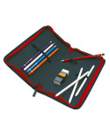 Trousse en polyester noir. Vide avec compartiment pour pinceaux, crayons et gommes à effacer.
